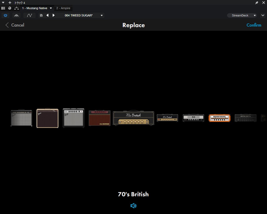 切り替えるにまずアンプヘッドをクリックし、各ツマミが表示されている場面で画面右下にある「Replace」から多数のヘッドに切り替えできます。