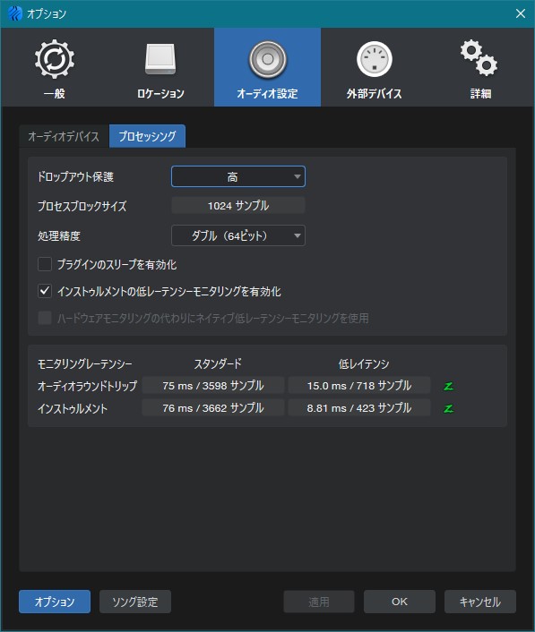 そして「中」より上に設定した場合のみ、インストゥルメントの低レイテンシーモニタリングを有効化することが出来ます。